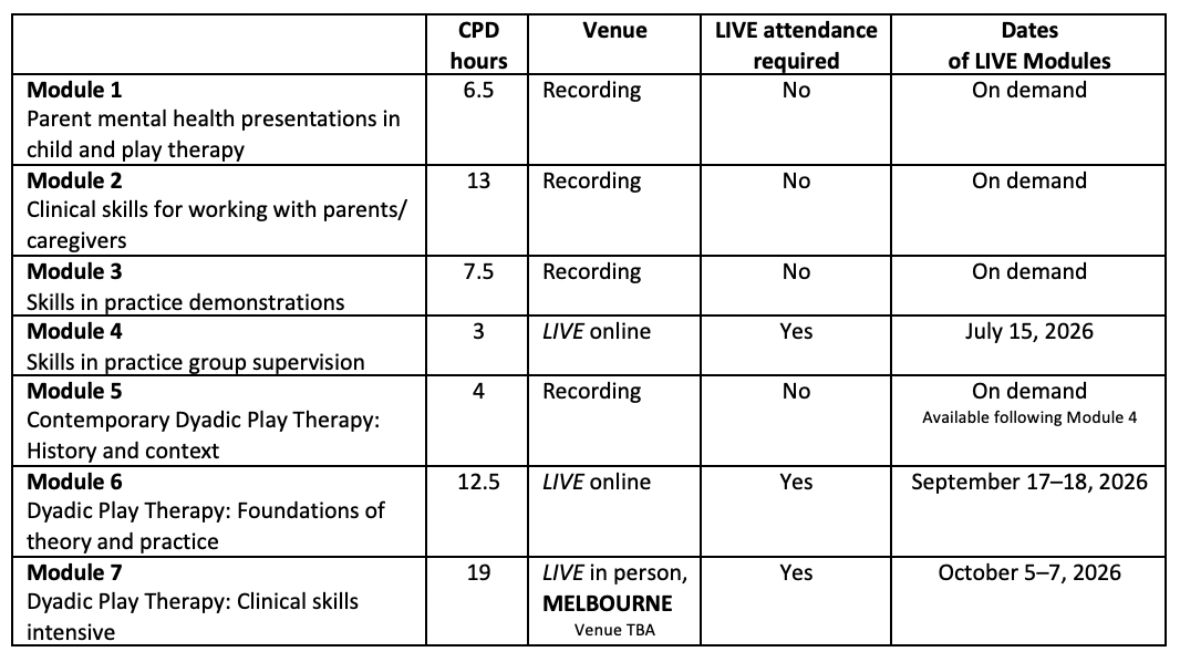 Note: If you have previously purchased Modules 1, 2, or 3, please email us to receive your discounted training fee for this Dyadic Play Therapy Training Program: admin@psychologyandplay.com.au